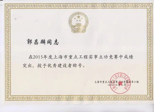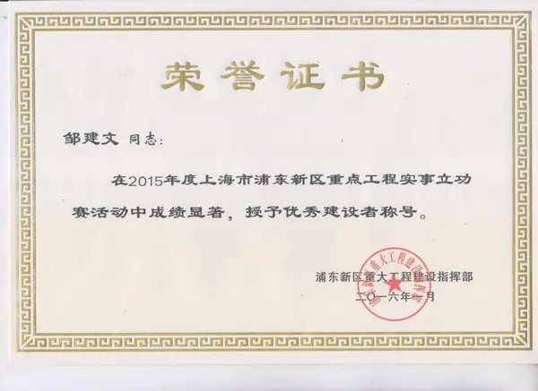 2015年,百通公司上下一心、銳意進取、團結拼搏,在上海市和浦東新區重點工程項目中作出了突出貢獻,取得了優秀成績。日前,在上海市和浦東新區重點工程實事立功競賽評比活動中,公司及個人取得了多項榮譽。公司被授予2015年上海市浦東新區重點工程實事立功“優秀公司”榮譽稱號,這項榮譽也是我司連續第十四年獲得;郭昌麟同志被授予上海市“優秀建設者”榮譽稱號;鄒建文同志被授予浦東新區“優秀建設者”榮譽稱號。