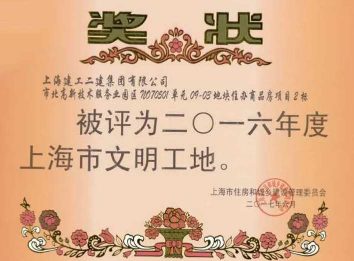 近日, 經(jīng)過有關(guān)方面多輪檢查評比,我司監(jiān)理的市北高新項目被評為“2016年度上海市文明工地”。