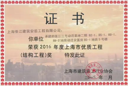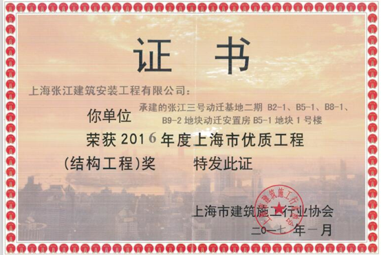 我司監理項目,張江三號動遷基地二期動遷安置房B5-1地塊1號樓、5號樓分別榮獲上海市2016年度優質工程(結構工程)獎。