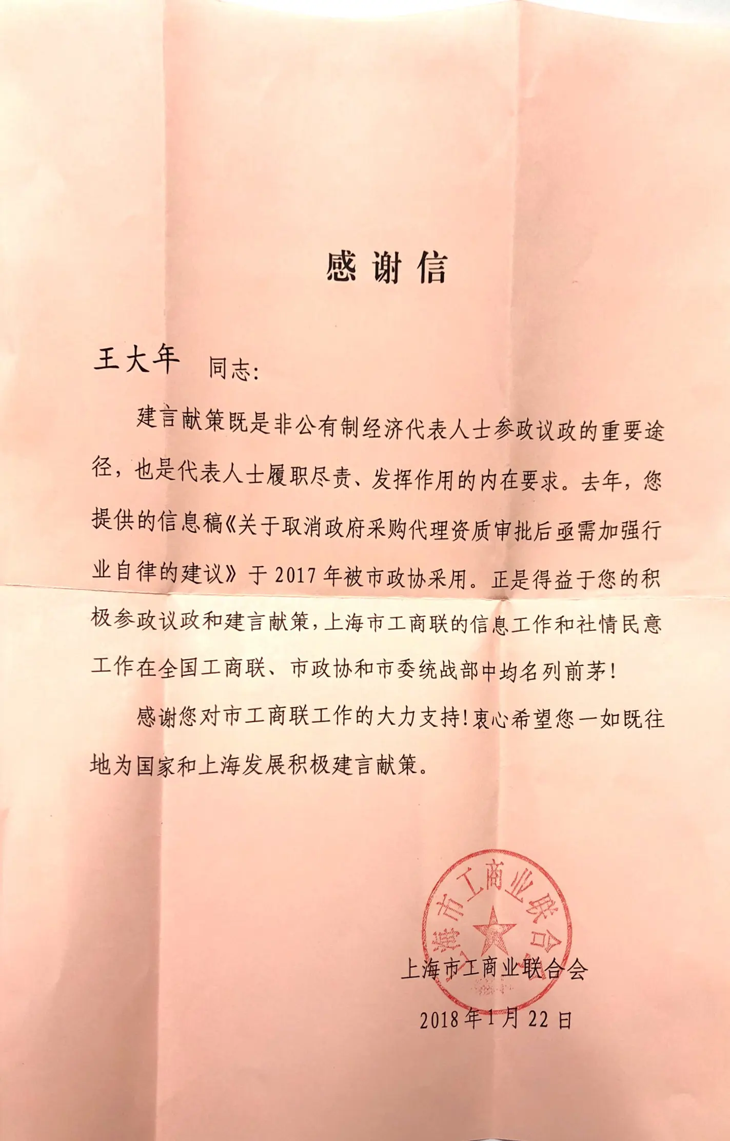 王大年董事長于2017年報送的建言獻策《關于取消政府采購的資質審批后亟需加強行業自律的建議》被上海市政協正式采用,上海市工商聯2018年1月22日為此專門發來了感謝信。