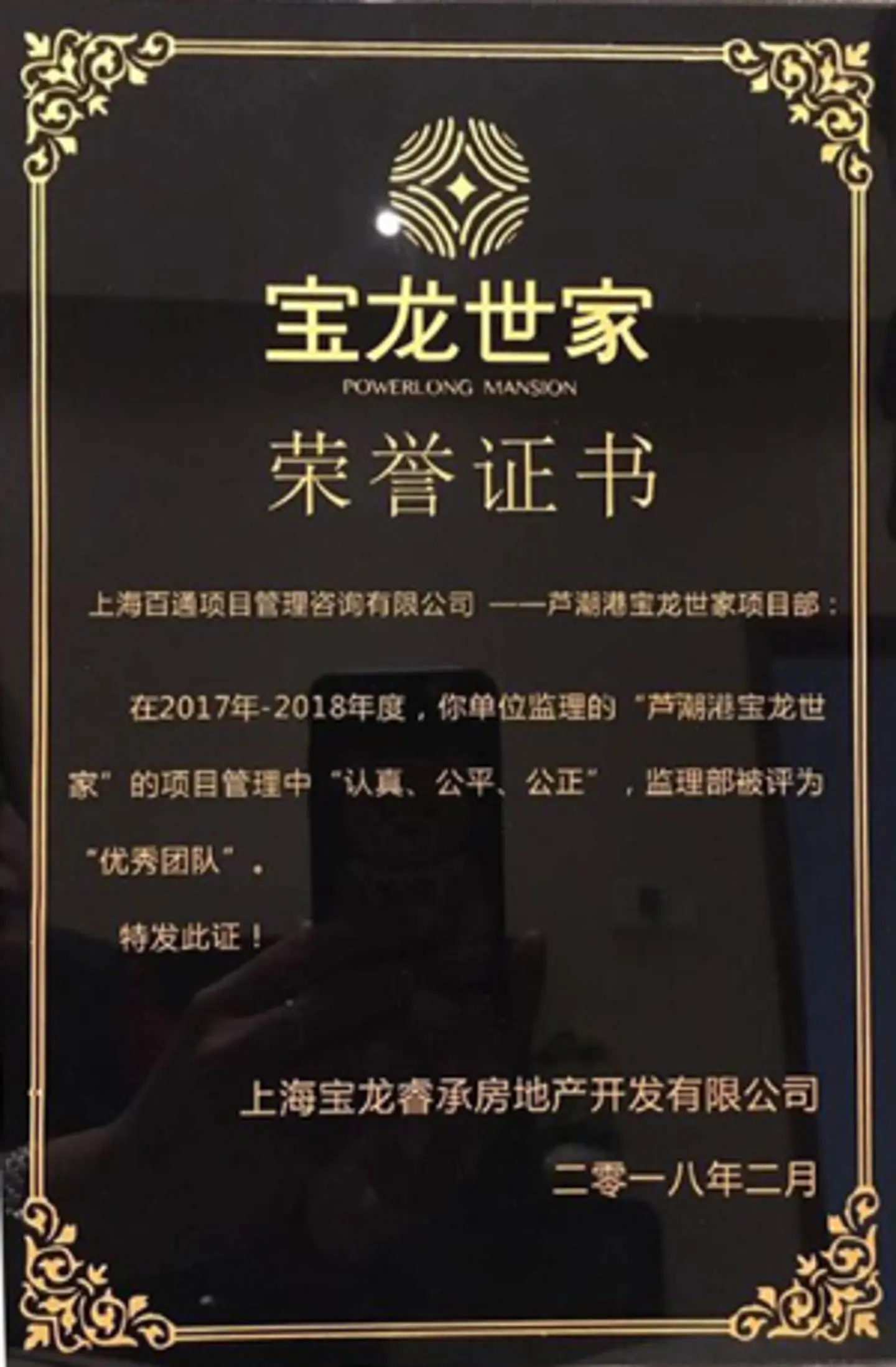 2017年,寶龍世家監理機構監理人秉承“認真、公平、公正”的工作態度和工作作風,展現了百通監理的風采,得到了業主的認可。在寶龍地產上海臨港公司2017年度表彰大會暨2018新春晚會上,臨港蘆潮港寶龍世家(臨港蘆潮港社區E0502地塊新建項目)監理機構獲得業主方授予2017年度—2018年度“優秀團隊”榮譽。