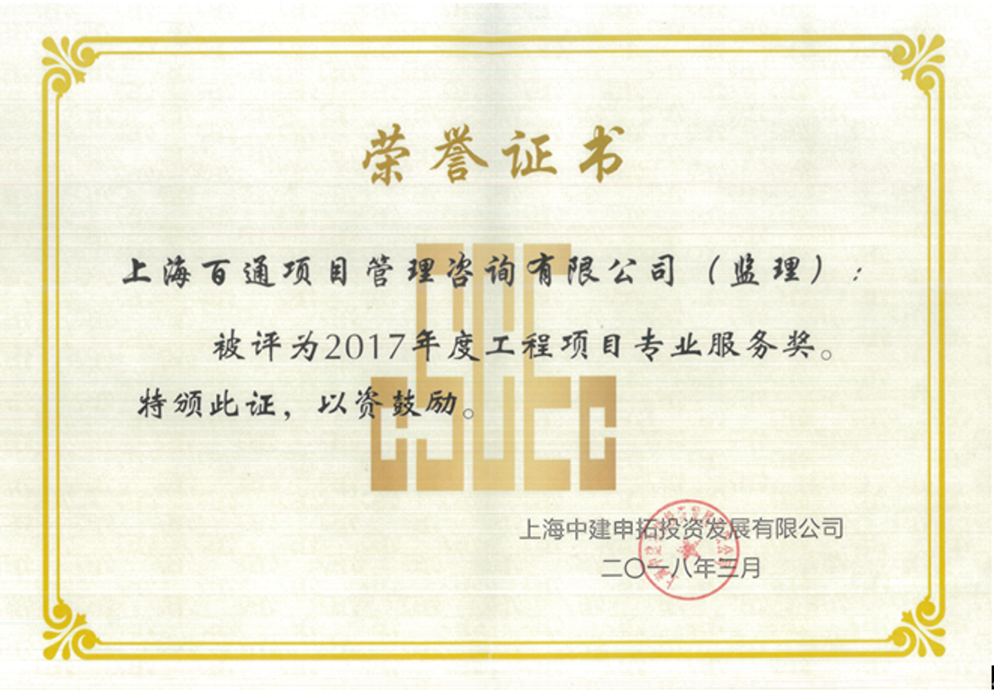 我司民樂大居K04-03、F04-02兩項目監理機構由于工作成效顯著獲得建設方贊譽。近日,建設方上海中建申拓投資發展有限公司向我上海百通項目管理咨詢有限公司 (監理)頒發了“2017年度工程項目專業服務獎”榮譽證書。