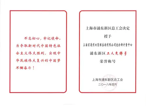 近日,在浦東新區慶祝五一國際勞動節暨勞模先進表彰大會上,我司造價部計量中心以優異出彩的工作成績、團結務實的工作作風,榮獲“浦東新區工人先鋒號”殊榮。此次表彰大會,浦東新區總工會共授予60個集體“浦東新區工人先鋒號”榮譽稱號。