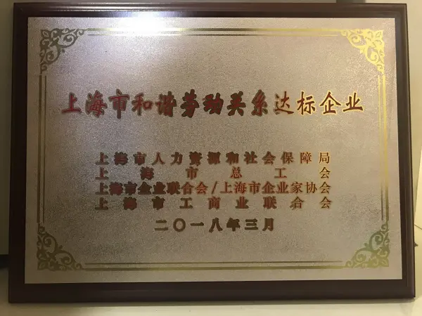 近日,經上海市浦東新區協調勞動關系三方委員會辦公室對我司人事勞動關系一系列嚴格的考核評估及評審,我司以高分順利通過規范性指標、建設性指標、發展性指標和感受性指標等70多個指標的測評,被市人保局、市總工會、市企業聯合會/市企業家協會、市工商業聯合會授予“上海市和諧勞動關系達標企業”稱號。
