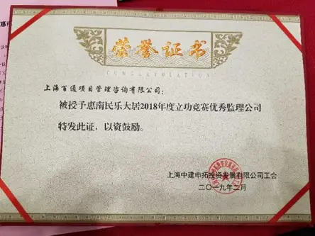 會上,建設單位通報了惠南民樂大居立功競賽年度考評情況,我司監理板塊惠南民樂大居K05-01地塊項目在監理組競賽評比中比分領先,建設單位向我司頒發了 “優秀監理公司”獎狀。