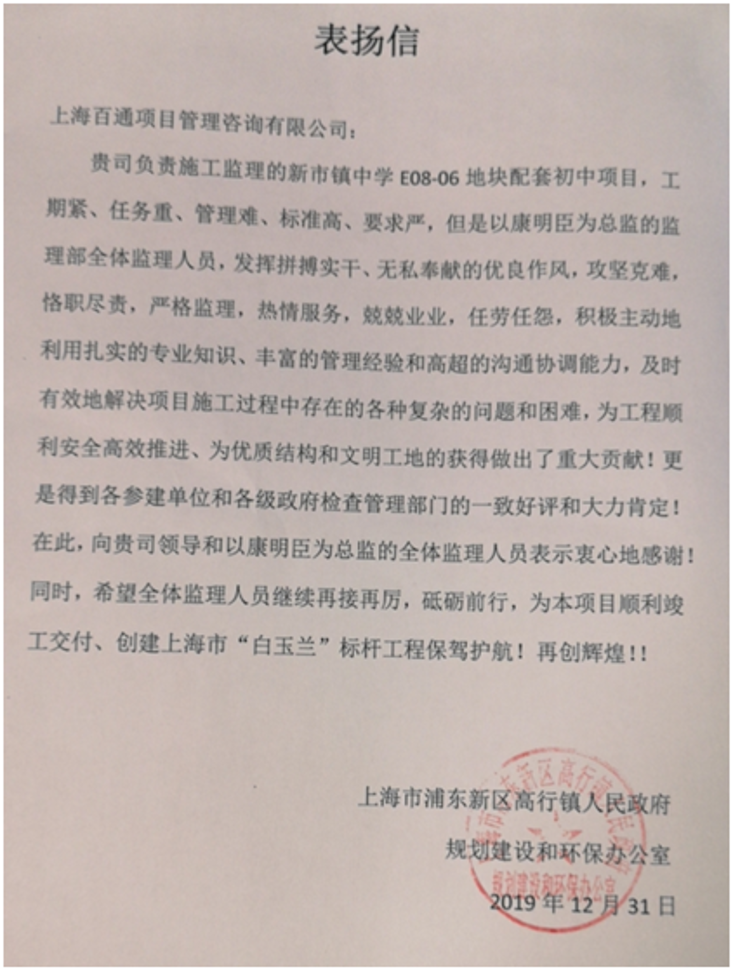 2、新市鎮中學E08-06地塊配套初中項目:該項目監理機構,工作上恪盡職守,積極主動,踏實敬業,為項目順利推進及項目獲評優質結構和文明工地貢獻重大,為此甲方特向我司發來表揚信,以茲感謝。