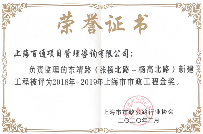 近日,我司監理部負責監理的東靖路(張揚北路~楊高北路)新建工程榮獲上海市市政公里行業協會頒發的2018年-2019年“上海市市政工程金獎”。