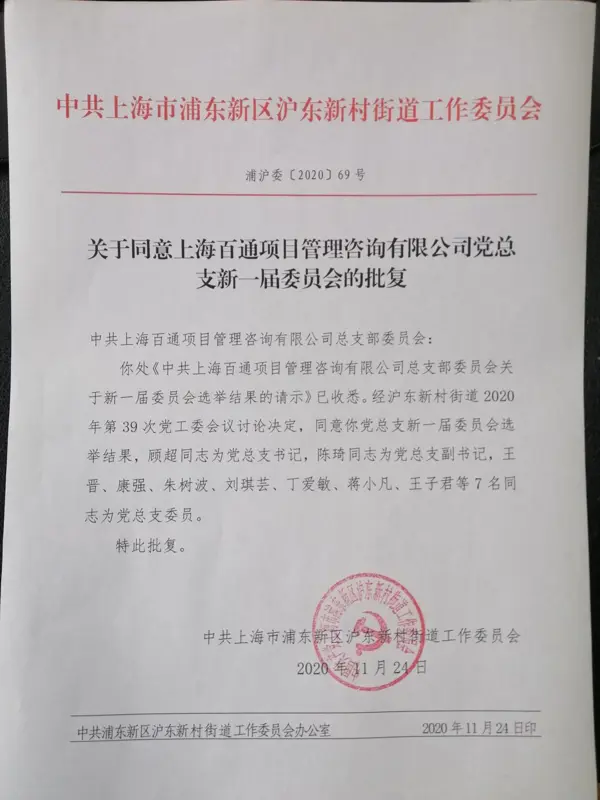 2020年11月24日,經我司全體中共黨員投票表決,并報請上級黨組織滬東新村街道2020年第39次黨工委會議討論同意,我司換屆選舉成立黨總支新一屆委員會,成員如下:顧超同志任黨總支書記;陳琦同志任黨總支副書記;王晉、康強、朱樹波、劉琪蕓、丁愛敏、蔣小凡、王子君等7名同志任黨總支委員。