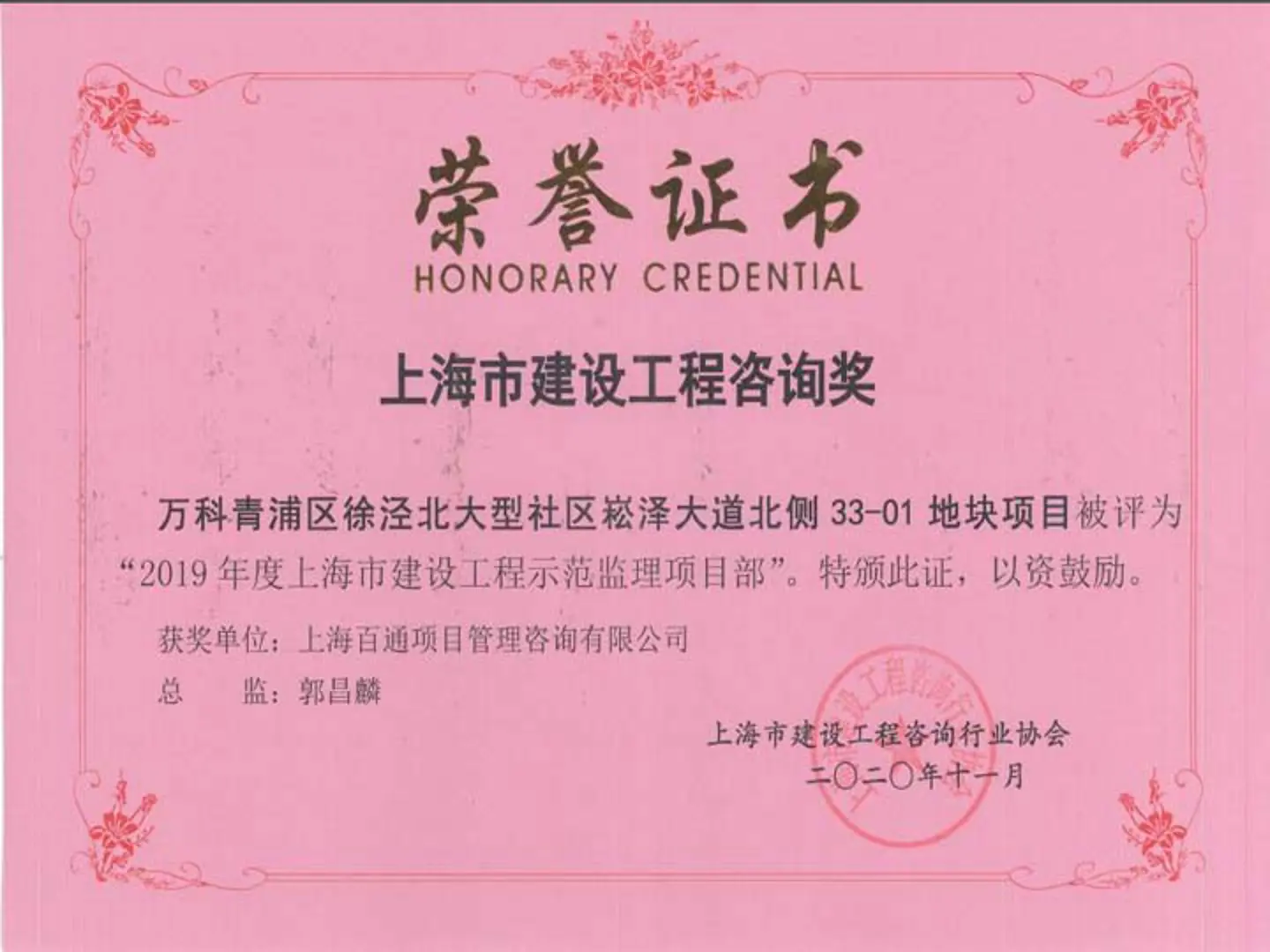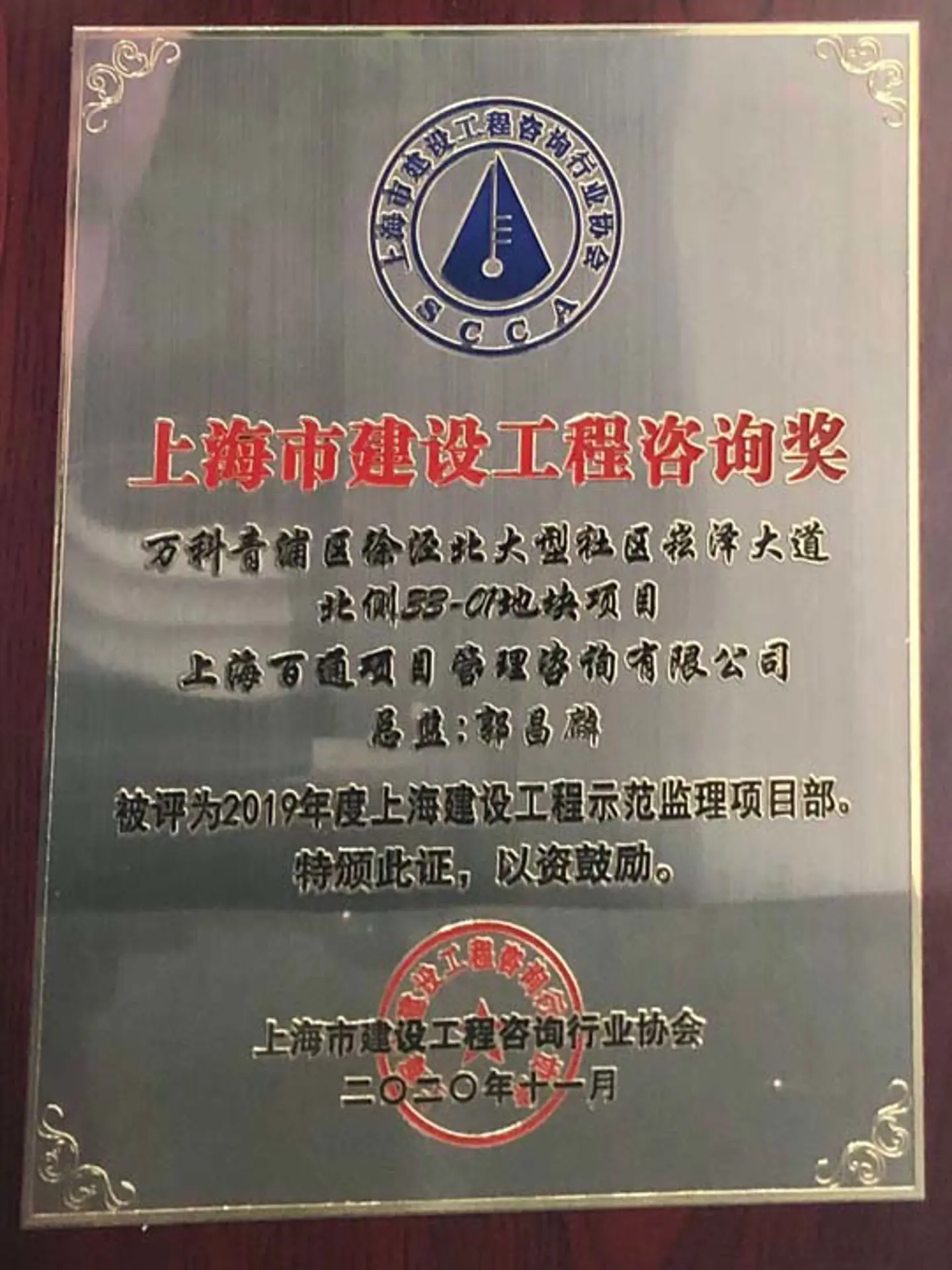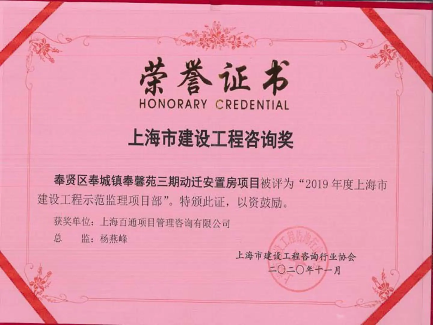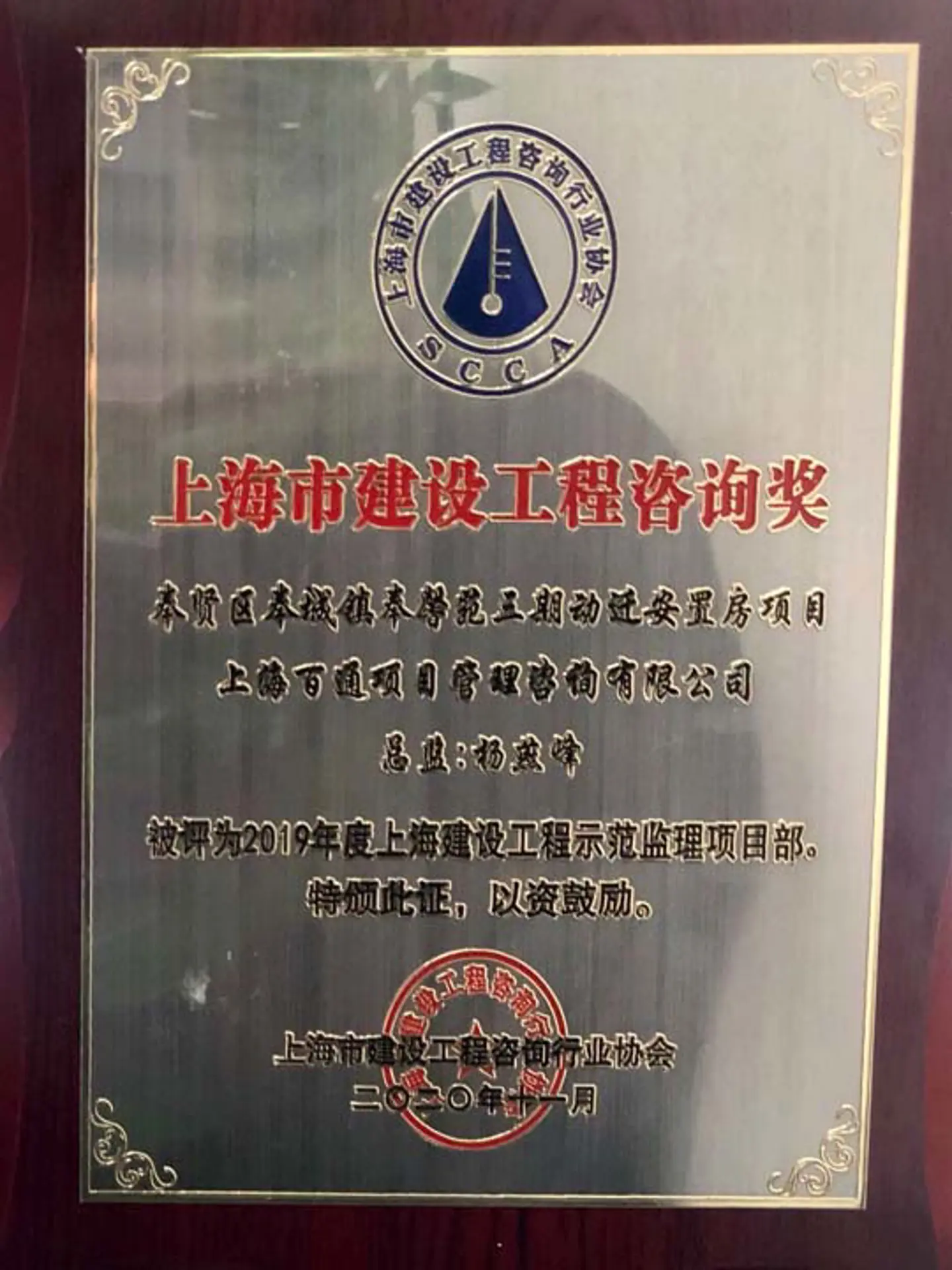 我公司監理的奉賢區奉城鎮奉馨院三期動遷房安置房項目、萬科青浦區徐涇北大型社區崧澤大道北側33-01地塊項目,在2020年上海市建設工程咨詢行業協會開展“創建示范監理項目部”活動中榮獲2019年度示范監理項目部稱號