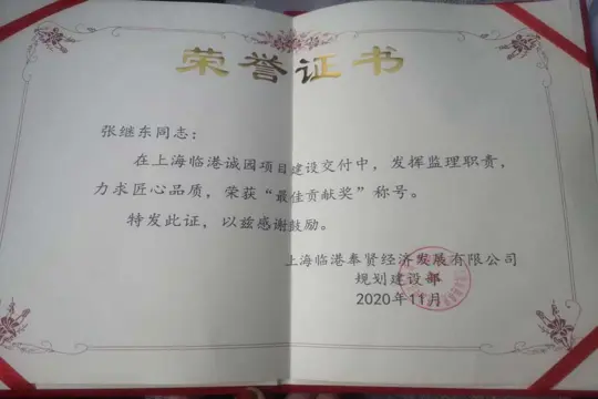 近日,我司監理部收到臨港誠園項目業主上海臨港奉賢經濟發展有限公司為張繼東總監頒發的“最佳貢獻獎”榮譽證書,表彰張繼東總監在上海臨港誠園項目建設交付中,發揮監理職責,力求匠心品質,使項目圓滿竣工交付。