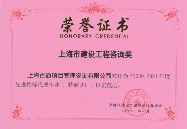 蟬聯上海市建設工程咨詢行業協會授予的2020-2021年度“先進招標代理企業”、“先進造價咨詢企業”、“先進工程監理企業”稱號