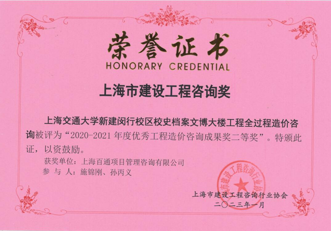 上海交通大學新建閔行校區校史檔案文博大樓工程全過程造價咨詢榮獲2020-2021年度“優秀工程造價咨詢成果獎二等獎”