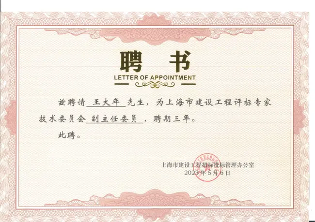 2023年5月6日下午,上海市建筑建材業(yè)市場管理總站舉行了上海市建筑工程評標專家技術委員會委員聘任會暨第一次會議,總站馬燕站長宣讀了上海市建設工程評標專家技術委員會成員名單,由同濟大學呂西林院士領銜以及36名成員組成。我司王大年董事長受聘為副主任委員兼經濟分會委員,并作了交流發(fā)言。市住建委裴曉副主任參加會議并作了重要講話。