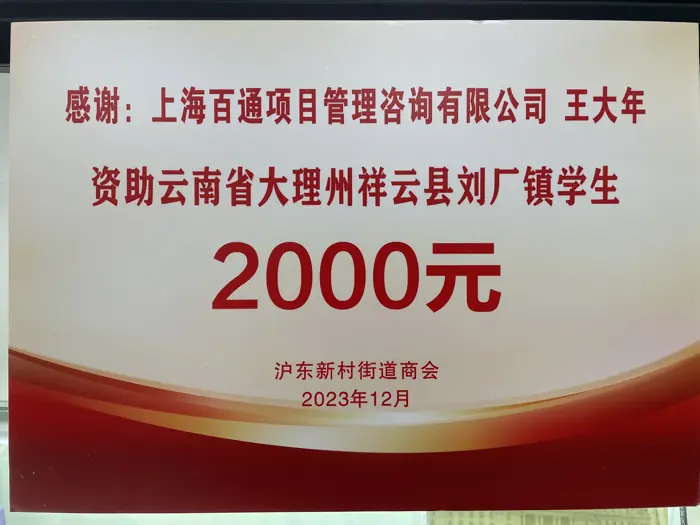 會上還頒發(fā)了榮譽獎項。我司在2023年積極參與浦東新區(qū)東西部協(xié)作對口幫扶云南大理、怒江工作,定向捐助10萬元用于云南省大理州祥云縣劉廠鎮(zhèn)松梅村2023年新建公共衛(wèi)生設(shè)施項目,以及王大年董事長資助云南省大理州祥云縣劉廠鎮(zhèn)學生,榮獲了滬東新村街道商會授予的2023年度“對口支援貢獻獎”。