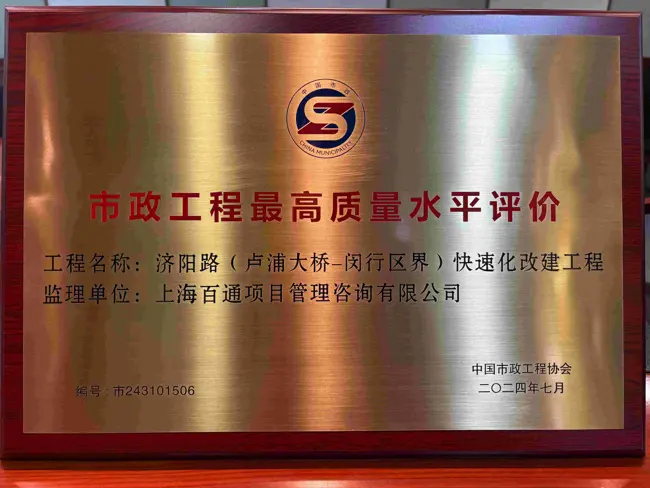近日,我司收到中國市政工程協會頒發的榮譽證書,表彰我司監理的濟陽路(盧浦大橋至閔行區界)快速化改建工程榮獲“2024年市政工程最高質量水平評價”獎。此獎項是百通監理斬獲的又一國家級榮譽,這不僅是對我司監理高質量服務的肯定,也標志著在市政工程領域的技術水平和管理能力再上新臺階。