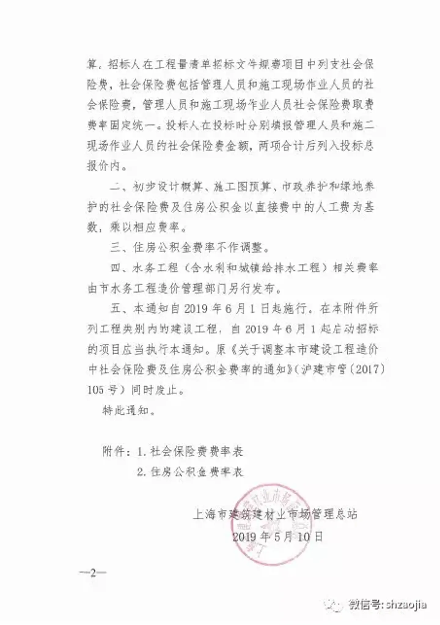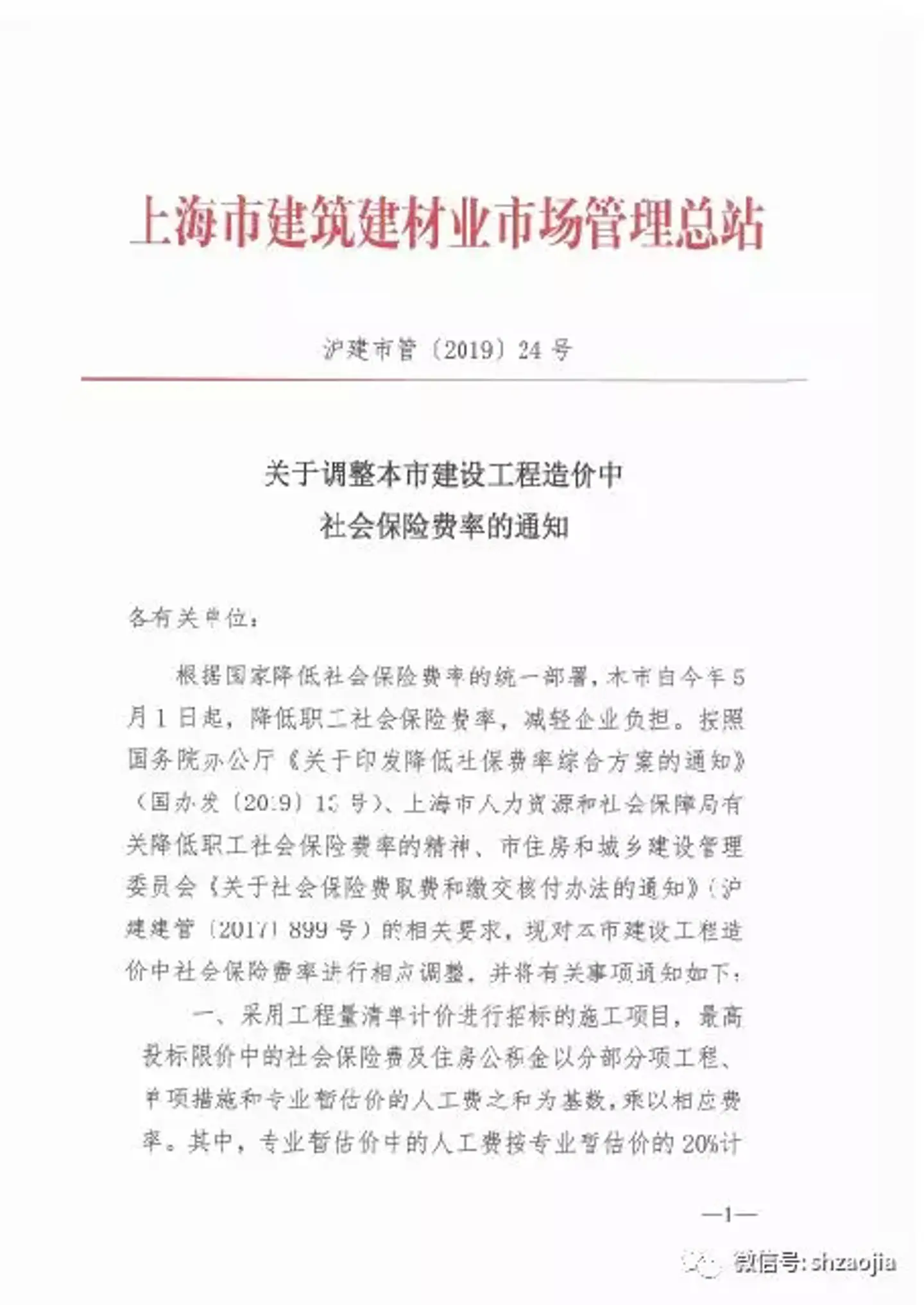 关于调整本市建设工程造价中社会保险费率的通知 沪建市管(2019)24号