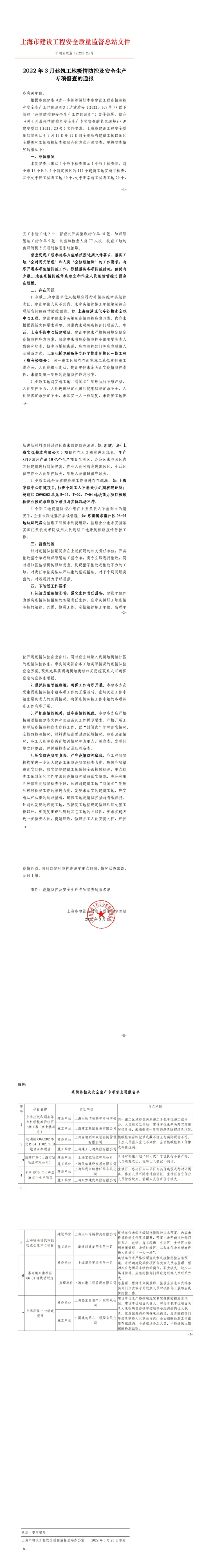 沪建安质监〔2022〕25 号《2022 年 3 月建筑工地疫情防控及安全生产 专项督查的通报》