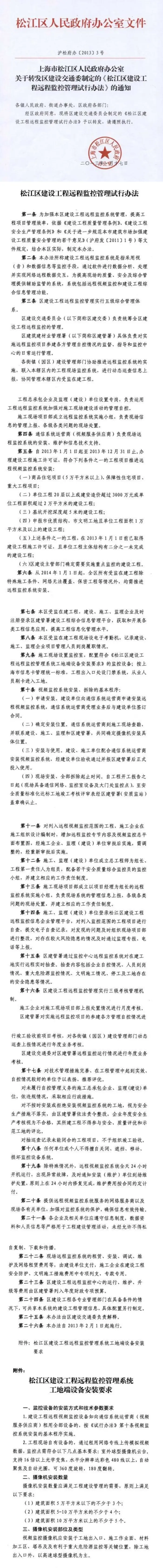 [松江]上海市松江区人民政府办公室关于转发区建设交通委制定的《松江区建设工程远程监控管理试行办法》的通知【沪松府办〔2013〕3号】