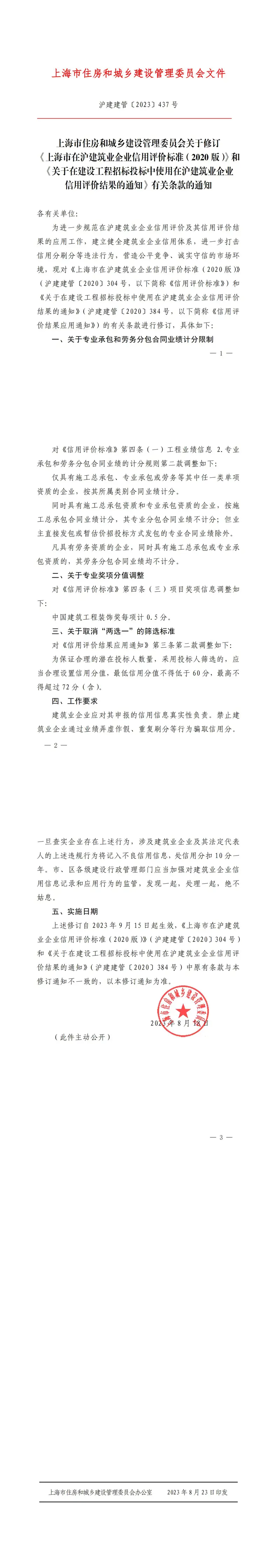 [市住建委]上海市住房和城乡建设管理委员会关于修订《上海市在沪建筑业企业信用评价标准(2020 版)》和《关于在建设工程招标投标中使用在沪建筑业企业信用评价结果的通知》有关条款的通知【沪建建管〔2023〕437 号】