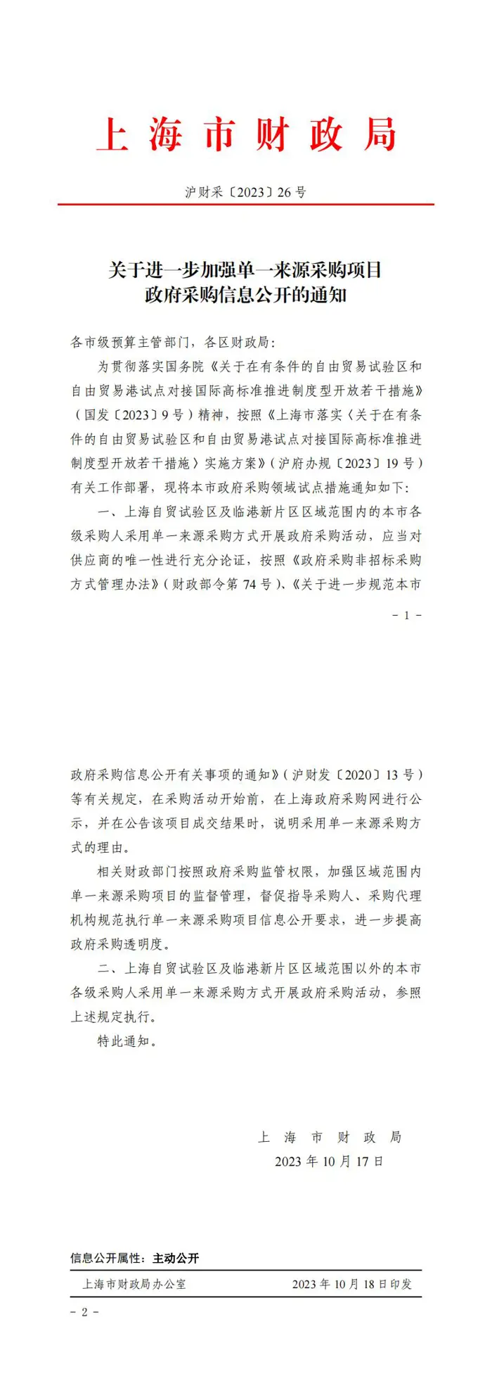 [市财政局]关于进一步加强单一来源采购项目政府采购信息公开的通知【沪财采〔2023〕26 号】