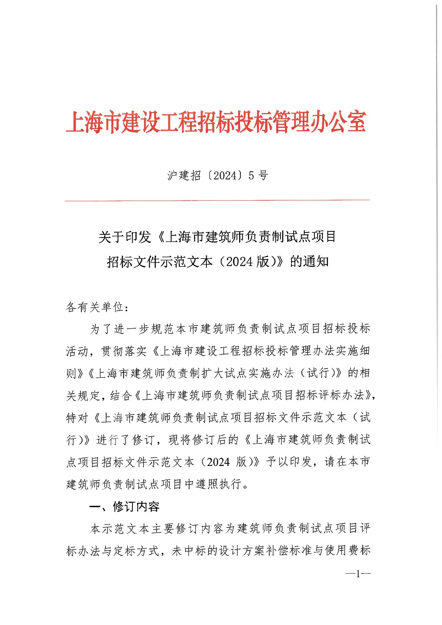 关于印发《上海市建筑师负责制试点项目招标文件示范文本(2024版)》的通知(沪建招〔2024〕5号)